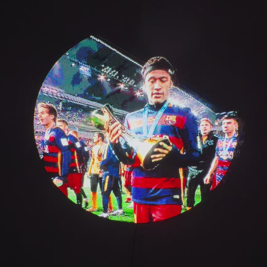 The SpinRay™ 3D Holographic Fan is a digital display device that creates the illusion of three-dimensional images by rapidly rotating LED light blades. Users can upload their own photos and videos through a mobile application, which also provides remote control of the device. The fan includes Bluetooth audio functionality, allowing sound playback to accompany visual content. It is lightweight, wall-mountable, and designed to project images and animations that appear to float in mid-air.